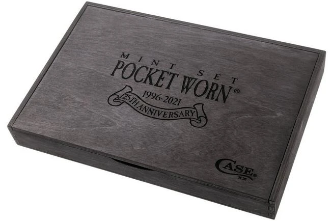 The Case 25th Anniversary Mint Set, Pocket Worn Olive Green Bone, Peach Seed Jig, 38190 is an amazing collector’s item for every Case enthusiast. Over 25 years Case has been producing its famous Pocket Worn Style handles. To celebrate they introduced this limited edition Pocket Worn Green Olive Bone set. Only 250 were produced. The eight classic Case knives this set is comprised of are the Trapper, Copperlock, Canoe, Muskrat, Mini Trapper, Copperhead, Peanut and the Stockman. Each of these knives is enhanced with a special engraving on the handles. To display these stunning knives Case used an authentic, wooden display case. A real eye-catcher for every collector.