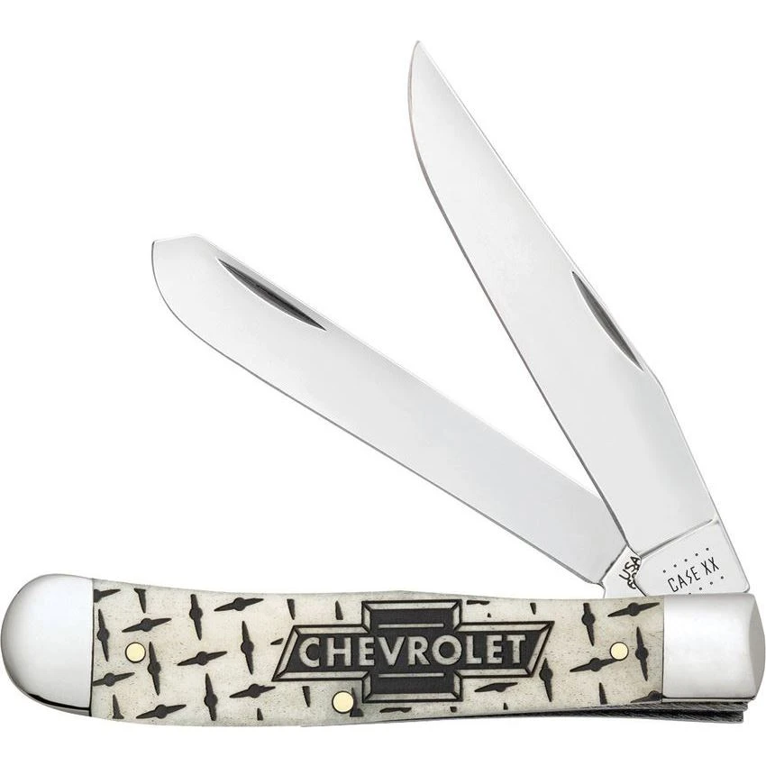 Model – CA33700. Chevrolet Trapper. 6254 SS pattern. 4.13 inch (10.49cm) closed. Mirror finish stainless clip and spey blades. Natural smooth bone handle. Nickel silver bolster(s). Chevrolet handle embellishment. Boxed. Proudly made here in the USA.