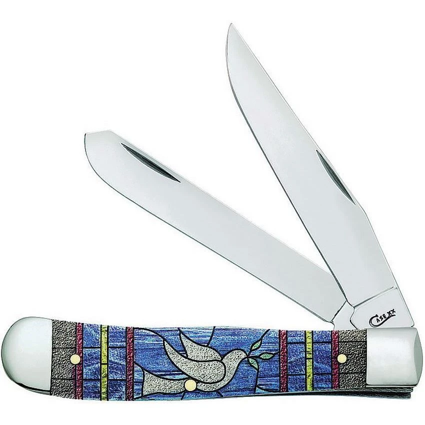 Model – CA38715. Trapper Stained Glass Dove. 6254 SS pattern. 4.13 inch closed. Mirror finish stainless clip and spey blades. Natural bone handle. Nickel silver bolster(s). Stained glass dove ColorWash handle. Boxed.