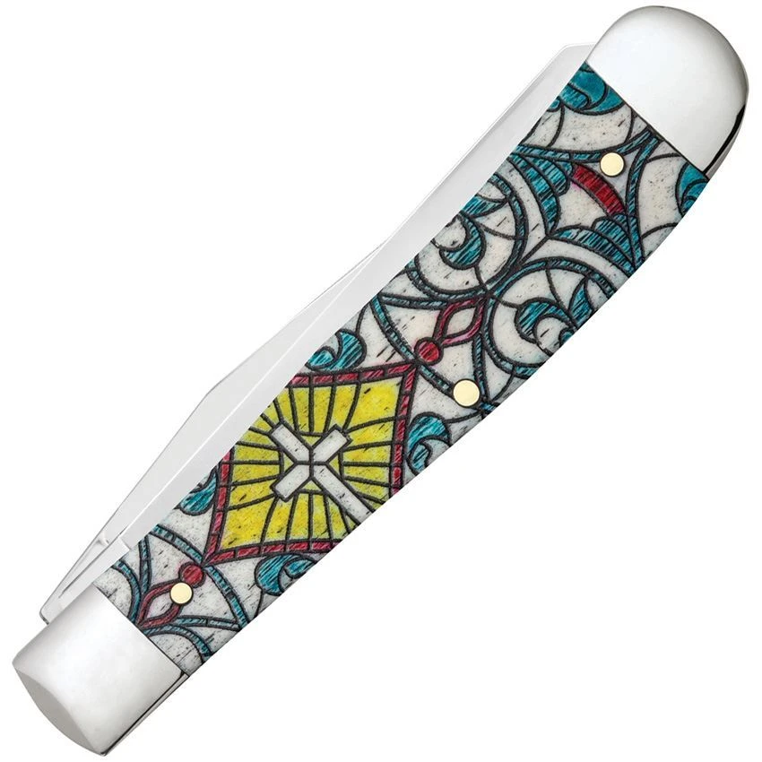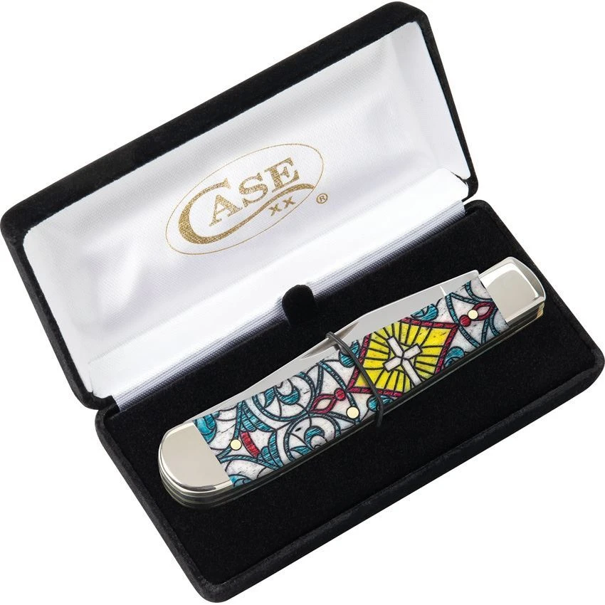Model/Part Number – CA38817. Case Trapper Stained Glass. 6254 SS pattern. 4.13″ (10.49cm) closed. Mirror finish stainless clip and spey blades. Stained glass color wash natural bone handle. Nickel silver bolster(s). Gift boxed. Made in USA.