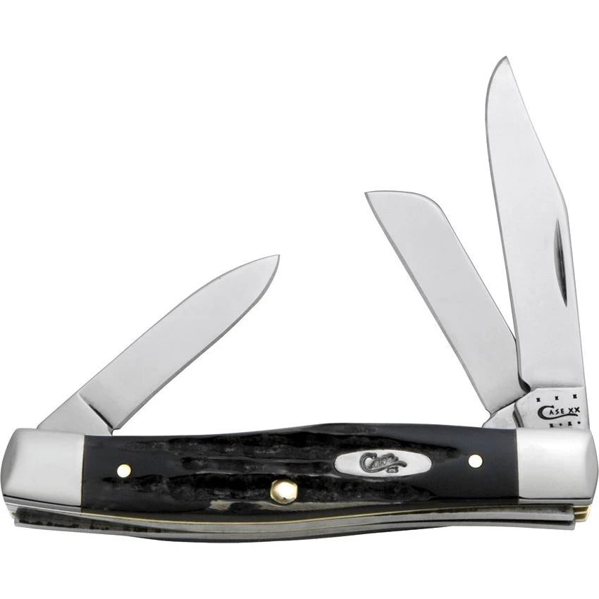 Model – CA65012. Case 65012 – Medium Stockman Buffalo Horn. BH3032SS pattern. 3 5/8″ closed. Stainless clip, sheepsfoot, and pen blades. Jigged natural buffalo horn handles with nickel silver bolsters and inlay shield. Proudly made in the USA.