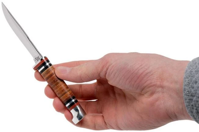 The Case Leather Hunter is a small fixed knife designed for the hunt. Because of its limited blade length and pointed tip it is perfect for gutting game. At the end of the handle you will find a beautiful aluminium pommel.